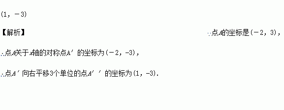 在平面直角坐标系中,点A的坐标是(-2,3),作点A关于x轴的对称点,得到点A',再将点A'向右平移3个单位得到点A'',则点A''的坐标是________.