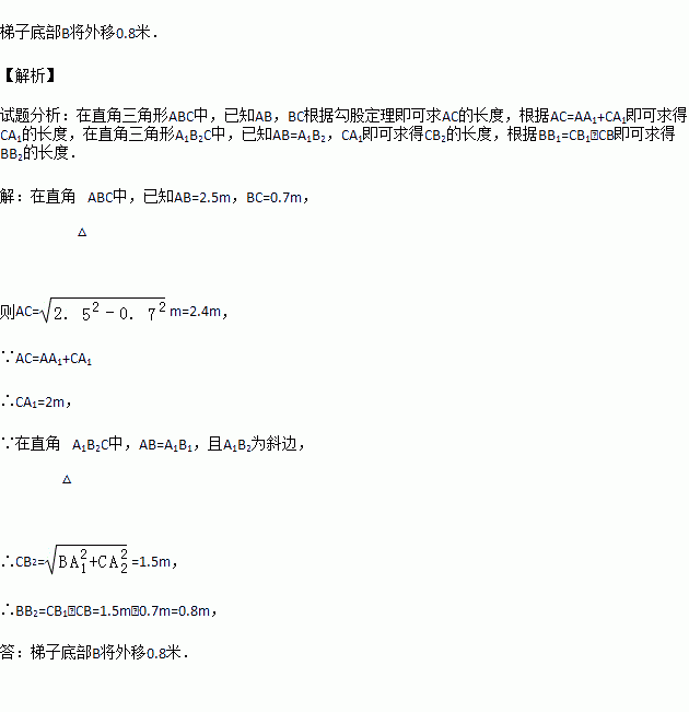 如图,一架2.5米长的梯子AB斜靠在竖直的墙AC上,这时梯子底部B到墙底端的距离为0.7米,考虑爬梯子的稳定性,现要将梯子顶部A沿墙下移0.4米到A1处,问梯子底部B将外移多少米?
