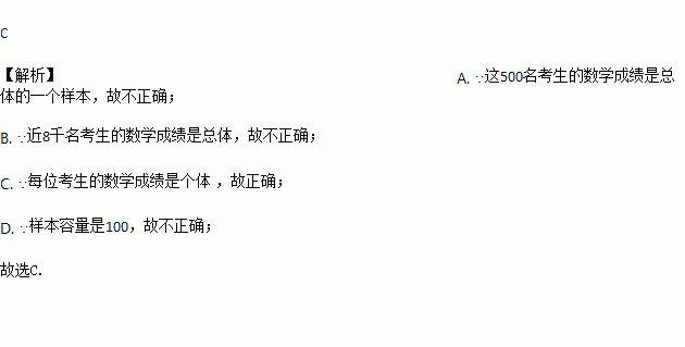 A. 这500名考生是总体的一个样本 B. 近8千名考生的数学成绩之和是总体
