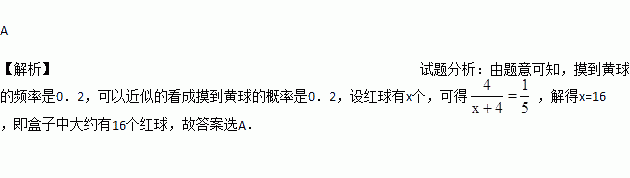在一个不透明的口袋中,装有若干个红球和4个黄球,它们除颜色外没有任可其他区别,摇匀后从中随机摸出一个球,记下颜色后再放回口袋中,通过大量重复摸球实验发现,摸到黄球的频率是0.2,则估计盒子中大约有红球( )