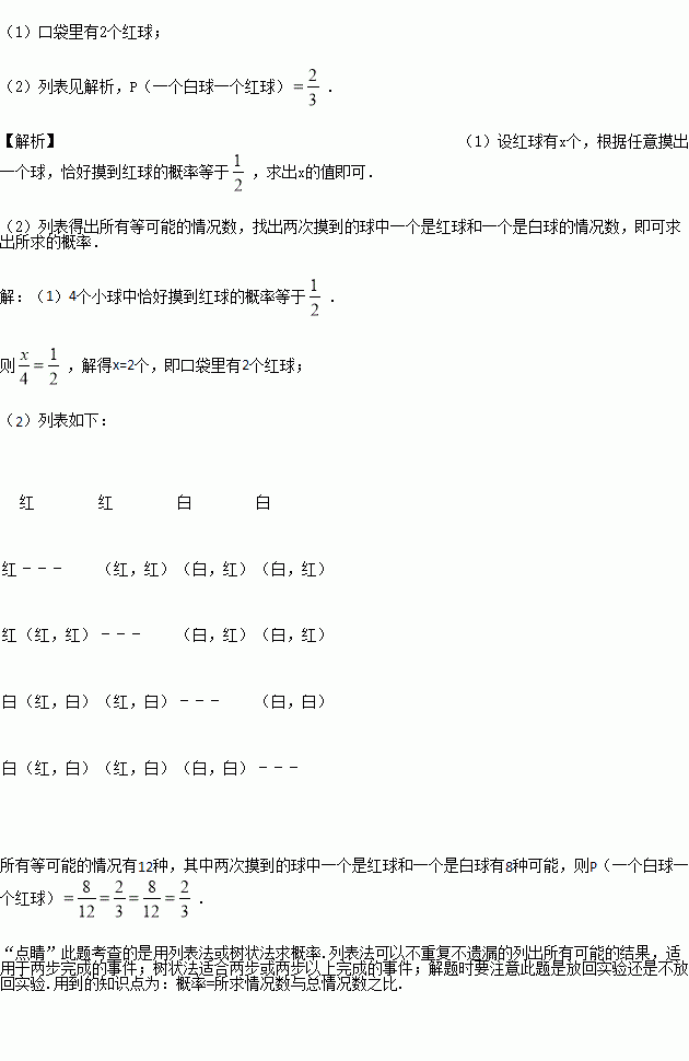 (2)先从中任意摸出一个球,从余下的球中再摸出一个球,请用列表法或树状图法求两次摸到的球中一个是红球和一个是白球的概率.