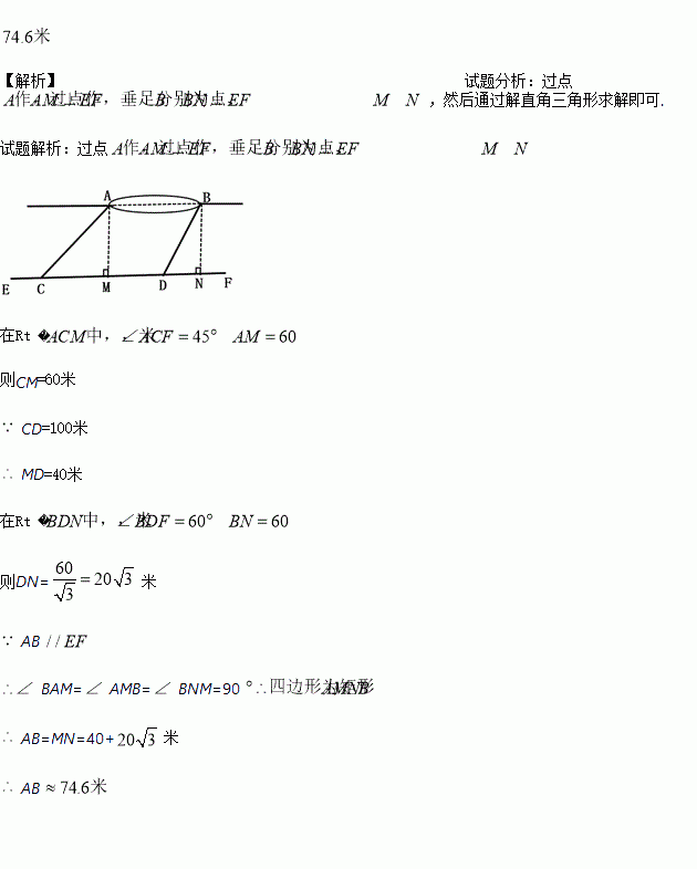 小明想测量位于池塘两端的A、B两点的距离.他沿着与直线AB平行的道路EF行走,当行走到点C处,测得∠ ACF=45°,再向前行走100米到点D处,测得∠ BDF=60°.若直线AB与EF之间的距离为60米,求A、B两点的距离.(结果保留三位有效数字,参考数据: