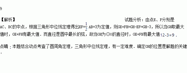 如图,AB是⊙O的一条弦,点C是⊙O上一动点,且∠ACB=30°,点E、F分别是AC、BC的中点,直线EF与⊙O交于G、H两点.若⊙O的半径为6,则GE+FH的最大值为_________.
