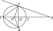 已知如图,PA切⊙O于A,AB⊥PO交⊙O于B,PO的延长线交⊙O于C,若∠APC=20°,则∠BCP="________°." ![]()