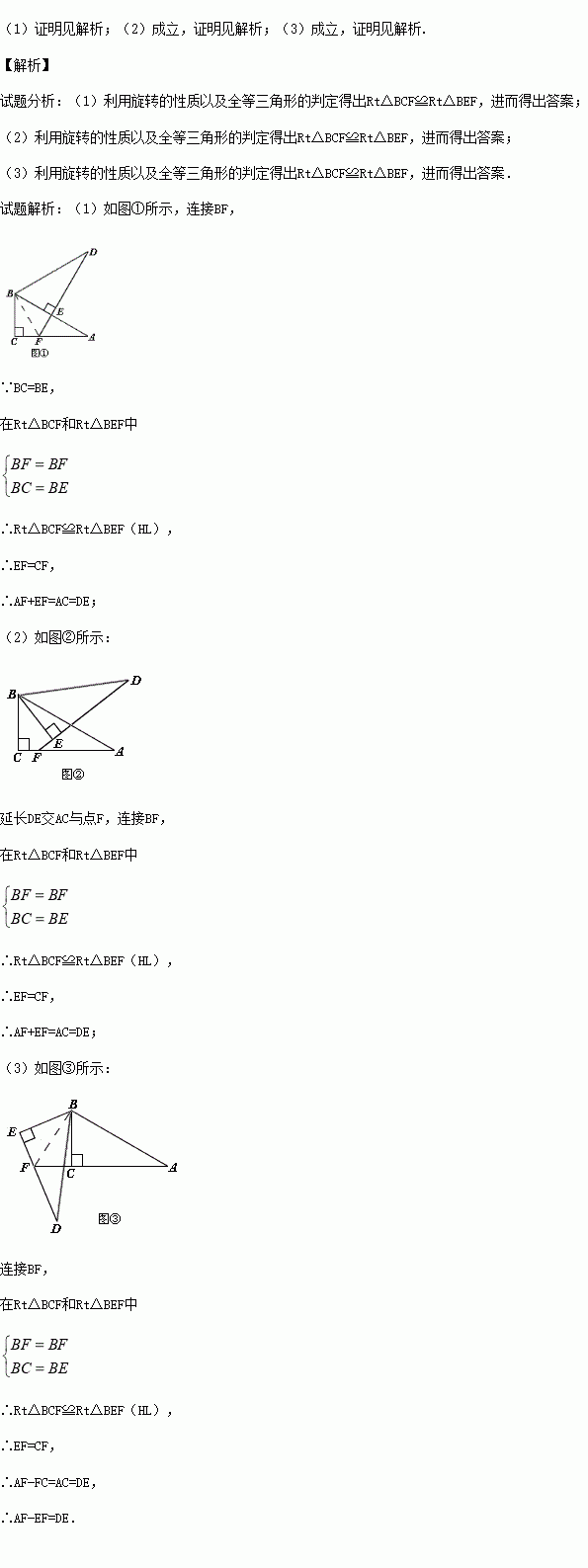£¨3£©Èô½«Í¼¢ÙÖеġ÷DBEÈÆµãB°´Ë³Ê±Õë·½ÏòÐýת½Ç¦Â£¬ÇÒ60¡ã£¼¦Â£¼180¡ã£¬ÆäËüÌõ¼þ²»±ä£¬Èçͼ¢Û£¬ÄãÈÏΪ£¨1£©ÖвÂÏëµÄ½áÂÛ»¹³ÉÁ¢Âð£¿Èô³ÉÁ¢£¬Ð´³öÖ¤Ã÷¹ý³Ì£»Èô²»³ÉÁ¢£¬Çëд³öAF¡¢EFÓëDEÖ®¼äµÄ¹ØÏµ£¬²¢ËµÃ÷ÀíÓÉ¡£
