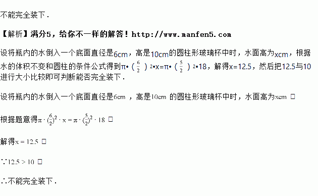 的圆柱形玻璃杯中,能否完全装下?若未能装满,求杯内水面离杯口的距离.![]()