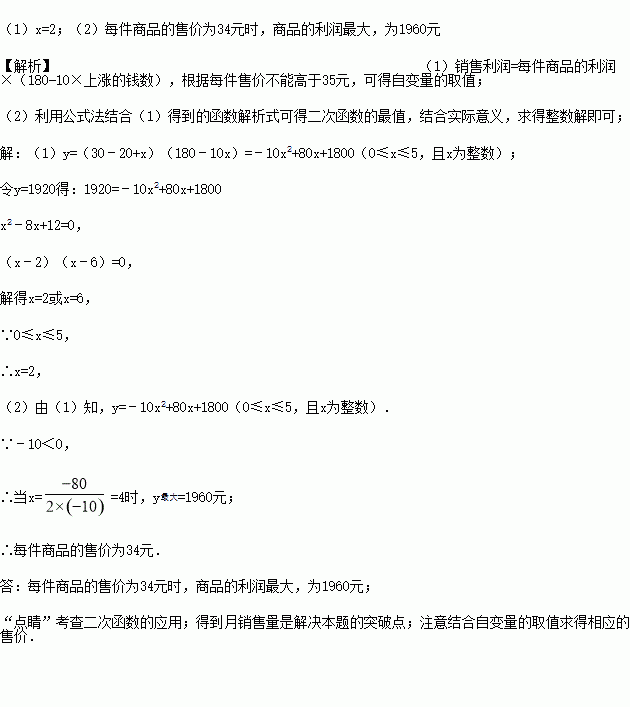 某商品的进价为每件20元,售价为每件30元,每个月可卖出180件;如果每件商品的售价每上涨1元,则每个月就会少卖出10件,但每件售价不能高于35元,设每件商品的售价上涨x元(x为整数),每个月的销售利润为y元.