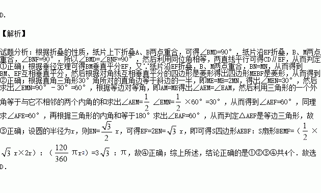 (3)将圆形纸片沿EF折叠,使B、M两点重合,折痕EF与AB相交于N,如图(4).