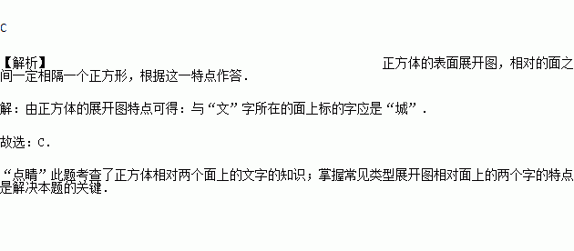 在市委、市府的领导下,全市人民齐心协力,将广安成功地创建为“全国文明城市”,为此小红特制了一个正方体玩具,其展开图如图所示,原正方体中与“文”字所在的面相对的面上标的字应是( )