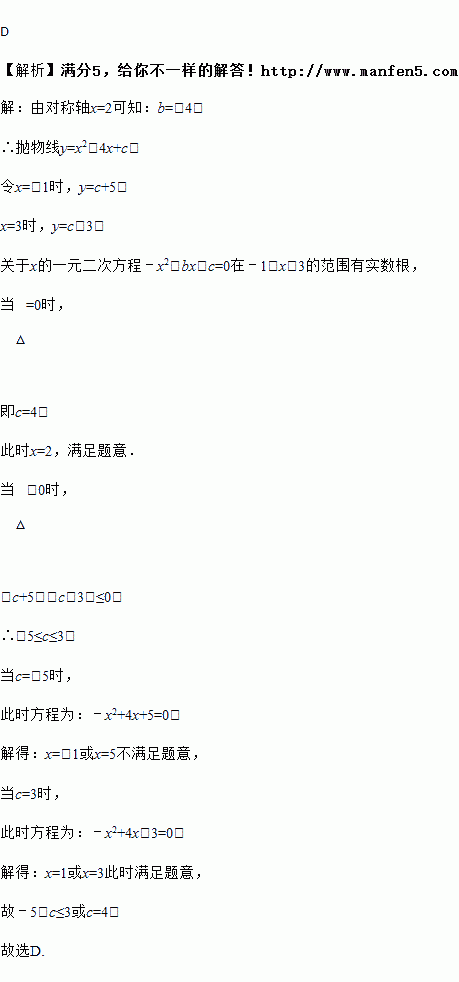 已知抛物线y=x2+bx+c的对称轴为x=2,若关于x的一元二次方程﹣x2﹣bx﹣c=0在﹣1<x<3的范围内有两个相等的实数根,则c的取值范围是( )