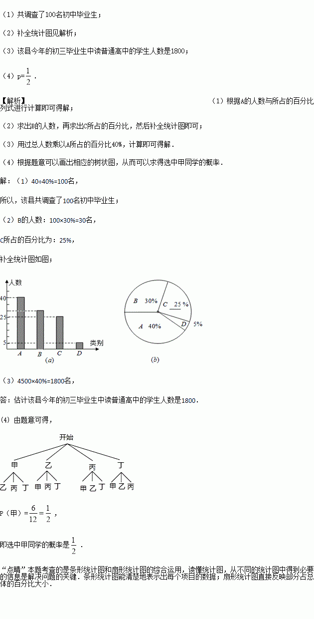 (4)老师想从甲、乙、丙、丁4位同学中随机选择两位同学了解他们毕业后的去向情况,请用树状图或列表法求选中甲同学的概率。
