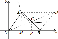 分析:设出点A的横坐标为x,根据点A在双曲线上,表示出点A的纵坐标,从而表示出点A的坐标,再根据点B在x轴上设出点B的坐标为(a,0),然后过A作AM⊥OB于M,CF⊥OB于F,如图,根据平行四边形的性质对角线互相平分得到点C为AB的中点,又CF∥AM,得到CF为△ABM的中位线,可得CF为AM的一半,而AM为A的纵坐标,可得出CF的长,由OB-OM可得BM的长,根据F为BM的中点,得到FB的长,由OB-FB可得出OF的长,由C在第一象限,由CF和OF的长表示出C的坐标,代入反比例解析式中,得到a=3x,再由BO与AM的积为平行四边形的面积,表示出平行四边形的面积,根据平行四边形AOBD的面积为,列出等式,将a=3x代入可得出k的值.