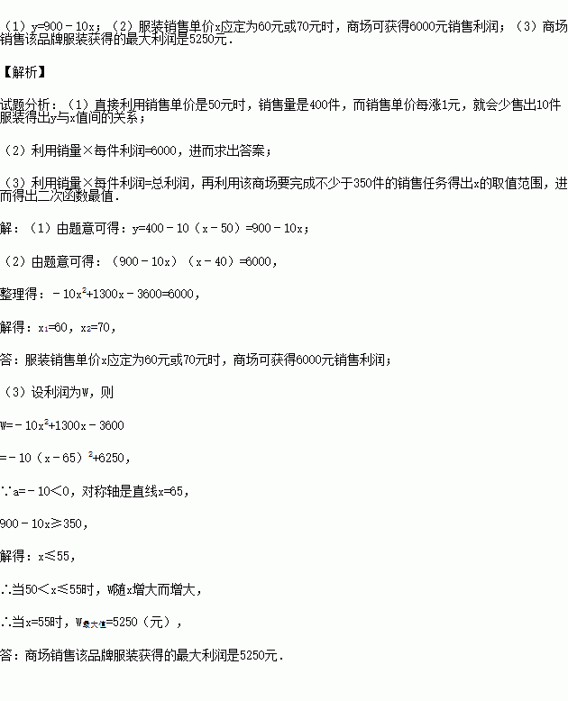 (3)在(1)问条件下,若该商场要完成不少于350件的销售任务,求商场销售该品牌服装获得的最大利润是多少?