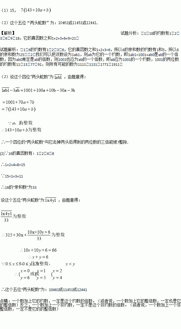 (2)已知两个“亲和数”的真因数之和都等于15,且这两个“亲和数”中较大的数能将一个正中间数位(百位)上的数为4的五位“两头蛇数”整除,若这个五位“两头蛇数”的千位上的数字小于十位上的数字,求满足条件的“两头蛇数”.