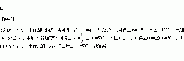 如图,在平行四边形ABCD中,∠B=80°,AE平分∠BAD交BC于点E,CF∥AE交AD于点F,则∠1=( )