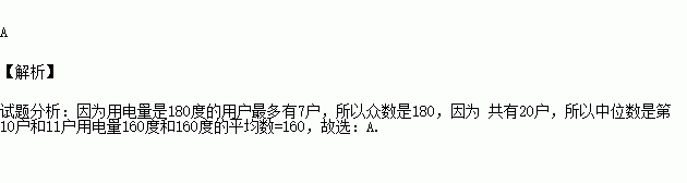 则这20户家庭该月用电量的众数和中位数分别是( )