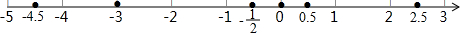 解答 解:如图所示:,用“>”把它们连接起来为:2.5>0.5>0>-$\frac{1}{2}$>-3>-4.5.