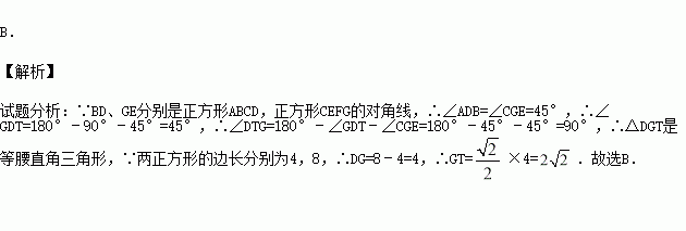 如图,边长分别为4和8的两个正方形ABCD和CEFG并排放在一起,连结BD并延长交EG于点T,交FG于点P,则GT=( )