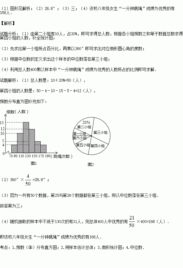 (4)若测试八年级女生“一分钟跳绳”次数不低于130次的成绩为优秀,本校八年级女生共有400人,请估算该校八年级女生“一分钟跳绳”成绩为优秀的人数.