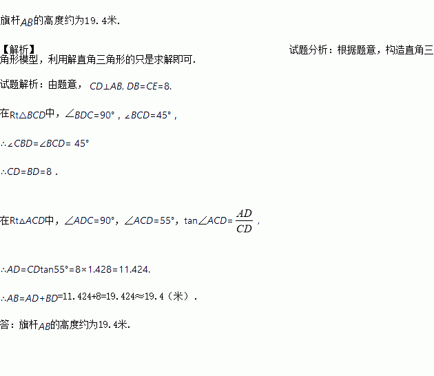如图,小东在教学楼距地面8米高的窗口C处,测得正前方旗杆顶部A点的仰角为55°,旗杆底部B点的俯角为45°,求旗杆AB的高.(结果精确到0.1米)