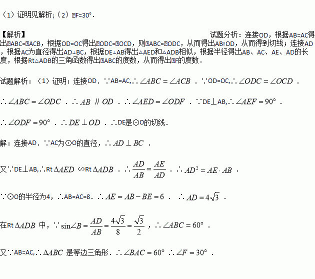 已知:如图,在△ABC中,AB=AC,以AC为直径的⊙O与BC交于点D,DE⊥AB,垂足为E,ED的延长线与AC的延长线交于点F。