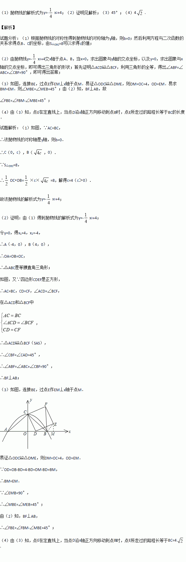 与x轴交于A,B两点,与y轴交于点C,连结AC、BC,D是线段OB上一动点,以CD为一边向右侧作正方形CDEF,连结BF,若S△OBC=8,AC=BC。