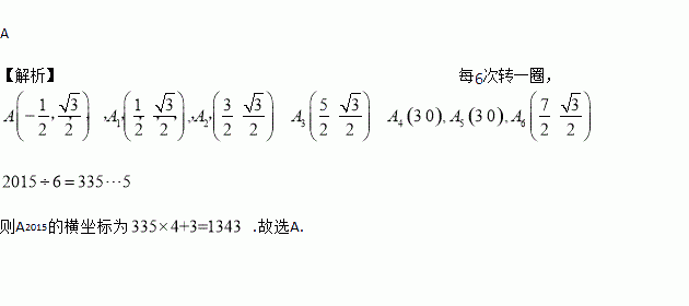 如图在坐标系中放置一菱形OABC,已知∠ABC=60°,OA=1.先将菱形OABC沿x轴的正方向无滑动翻转,每次翻转60°,连续翻转2015次,点A的落点依次为A1,A2,A3,…,则A2015的坐标为 ( ) .