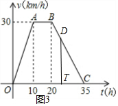×ÛÉÏËùÊö£ºvÓëʱ¼ätµÄº¯Êý½âÎöʽΪv=$\left\{\begin{array}{l}{3t£¨0¡Üt¡Ü10£©}\\{30£¨10£¼t£¼20£©}\\{-2t+70£¨20¡Üt¡Ü35£©}\end{array}\right.$£®