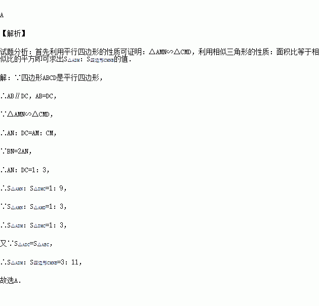(2015•枣庄校级模拟)如图,四边形ABCD是平行四边形,点N是AB上一点,且BN=2AN,AC、DN相交于点M,则S△ADM:S四边形CMNB的值为( )