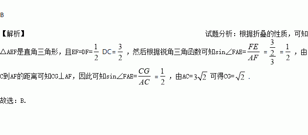 如图,沿对角线AC折叠正方形ABCD,使得B、D重合,再折叠△ACD,点D恰好落在AC上的点E处,测得折痕AF的长为3,则C到AF的距离CG为: