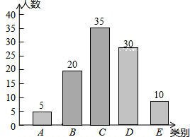 分析 (1)用总人数乘以B类别百分比可得m的值,用总人数减去A、B、D、E的人数可得C类别人数,补全条形统计图;