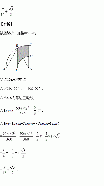 如图,在扇形AOB中,∠AOB=90°,点C为OA的中点,CE⊥OA交弧AB于点E,以点O为圆心,OC为半径作弧CD交OB于点D,若OA=2,则阴影部分的面积为 .