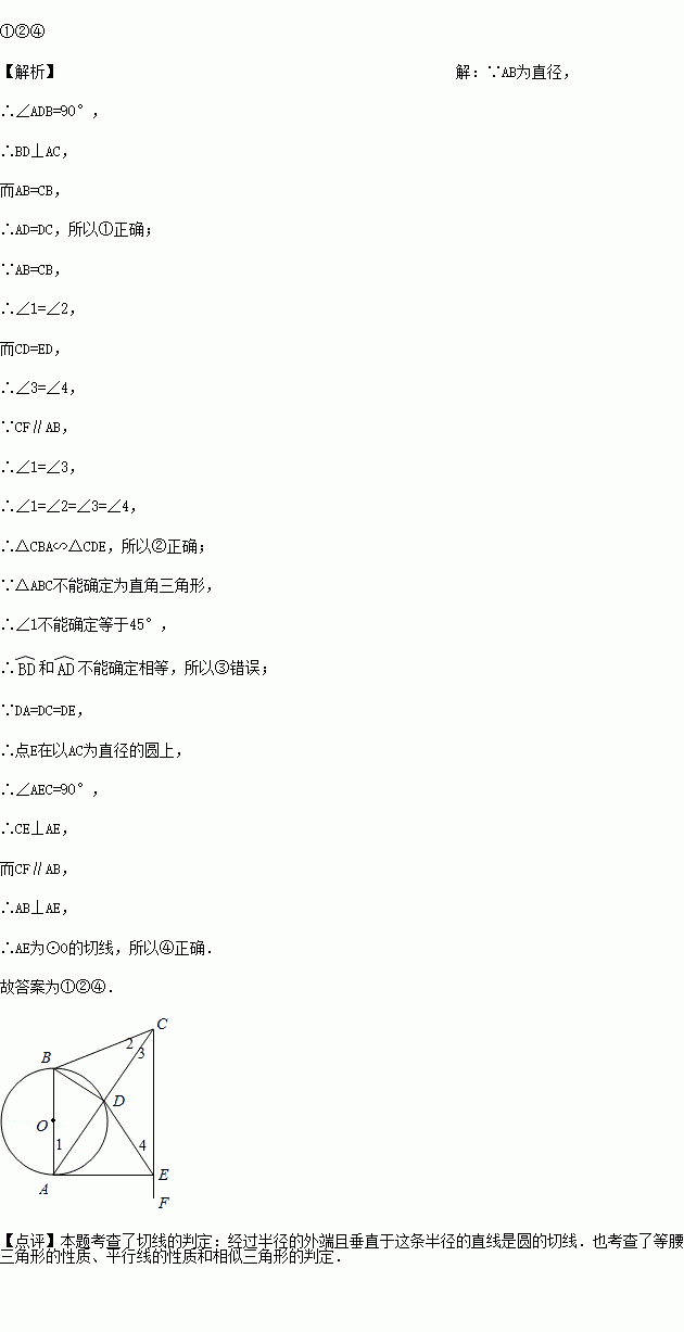 如图,在△ABC中,AB=CB,以AB为直径的⊙O交AC于点D,过点C作CF∥AB,在CF上取一点E,使DE=CD,连接AE,对于下列结论:①AD=DC;②△CBA∽△CDE;③