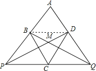分析:连接BD,利用等边三角形的判定与性质得出△ABD为等边三角形,进而得出△PBC∽△CDQ,再利用已知得出△PBD∽△BDQ,求出△BMD∽△BDQ进而得出答案.