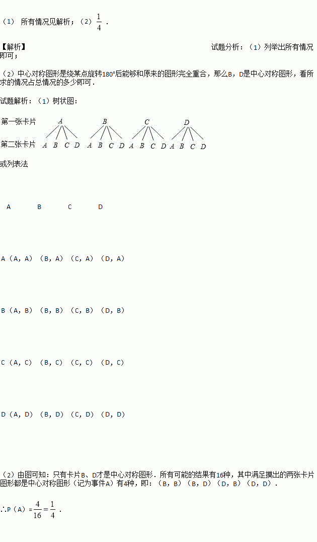 (1)用树状图(或列表法)表示两次摸出卡片所有可能的结果;(卡片可用A、B、C、D表示)