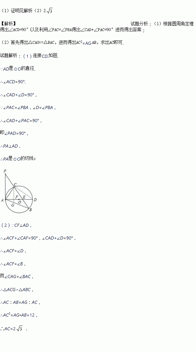 如图,在△ABP中,C是BP边上一点,∠PAC=∠PBA,⊙O是△ABC的外接圆,AD是⊙O的直径,且交BP于点E.