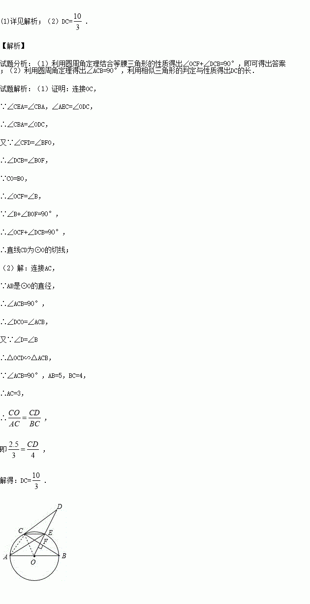 如图,AB是⊙O的直径,OD⊥弦BC于点F,交⊙O于点E,连结CE、AE、CD,若∠AEC=∠ODC.