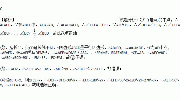 中,AD=2AB,F是AD的中点,作CE⊥AB,垂足E在线段AB上,连接EF、CF,则下列结论:(1)∠DCF=