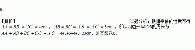 如图,将边长为5cm的等边△ABC沿边BC向右平移4 cm得到△A/B/C/,则四边形AA/C/B的周长为( )
