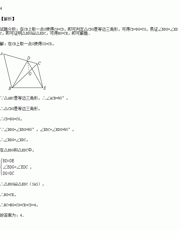 (2015秋•靖江市期末)如图,△ABC是等边三角形,点D为AC边上一点,以BD为边作等边△BDE,连接CE.若CD=1,CE=3,则BC= .