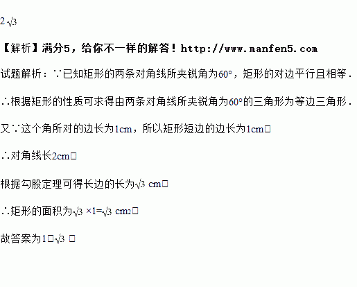 矩形的对角线相交成的角中,有一个角是60°,这个角所对的边长为1cm,则其对角线长为________cm,矩形的面积为_________cm2.