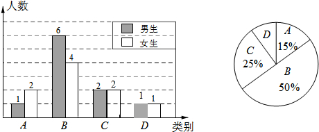 分析 (1)根据B类有6+4=10人,所占的比例是50%,据此即可求得总人数;利用求得的总人数乘以对应的比例即可求得C类的人数,然后求得C类中女生人数,同理求得D类男生的人数;