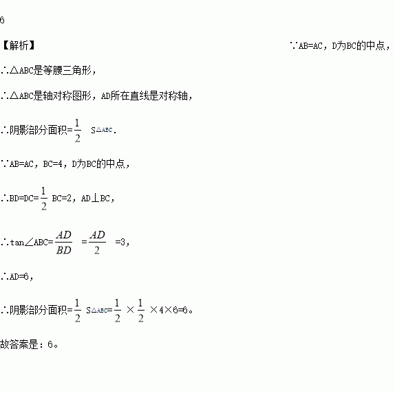 如图,在等腰三角形中,AB=AC,BC=4,D为BC的中点,点E、F在线段AD上,tan∠ABC=3,则阴影部分的面积是 _________ .