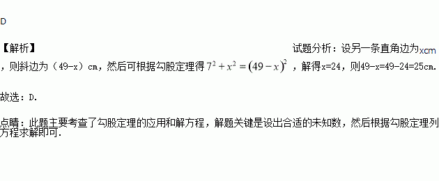 一直角三角形的一条直角边长是7cm,另一条直角边与斜边长的和是49cm,则斜边( )