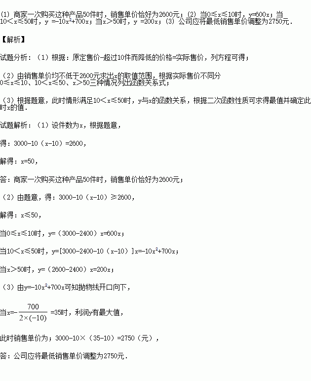 (1)商家一次购买这种产品多少件时,销售单价恰好为2600元?
