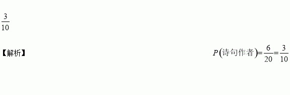 学校组织“中华经典诗词大赛”,共设有20个试题,其中有关“诗句理解”的试题10个,有关“诗句作者”的试题6个,有关“试卷默写”的试题4个.小杰从中任选一个试题作答,他选中有关“诗句作者”的试题的概率是_______________ ;