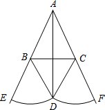 1.如图,在△ABC中,AB=AC.分别以B、C为圆心,BC长为半径,BC下方画弧,设两弧交于点D,与AB、AC的延长线分别交于点E、F,连接AD、BD、CD.若BC=6,∠BAC=50°,求弧ED,弧FD的长度之和(结果保留π).