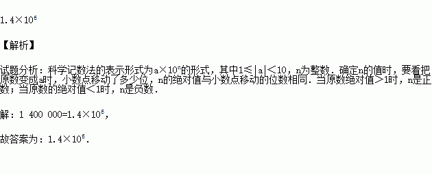 (2013•盐城)2013年4月20日,四川省雅安市芦山县发生7.0级地震.我市爱心人士情系灾区,积极捐款,截止到5月6日,市红十字会共收到捐款约1400000元,这个数据用科学记数法可表示为 元.