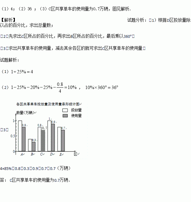 (3)该公司在全市投放的共享单车的使用量占投放量的85%,请计算C区共享单车的使用量并补全条形统计图.