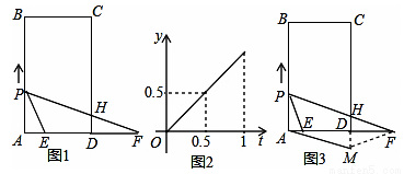 如图1,矩形ABCD中,AB=7cm,AD=4cm,点E为AD上一定点,F为AD延长线上一点,且DF=acm,点P从A点出发,沿AB边向点B以2cm/s的速度运动,运动到B点停止,连结PE,设点P运动的时间为ts,△PAE的面积为ycm2,当0≤t≤1时,△PAE的面积y(cm2)关于时间t(s)的函数图象如图2所示,连结PF,交CD于点H.